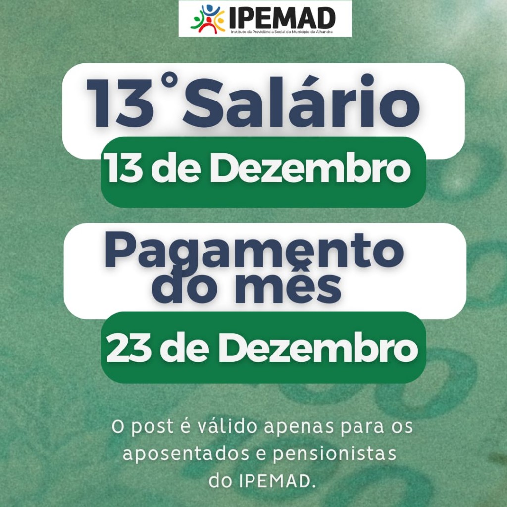 O IPEMAD informa que o décimo terceiro dos aposentados e pensionistas será pago no dia 13/12/2024 e o pagamento do mês será antecipado para o dia 23/12/2024 devido as festividades.Fonte: IPEMADAutor: Bruna Bezerra